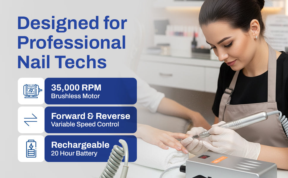• Professional Power & Precision with 35K RPM Brushless Motor - Designed for nail technicians, this professional nail drill delivers high torque and 35,000 RPM for seamless gel polish removal, acrylic shaping, and manicures.