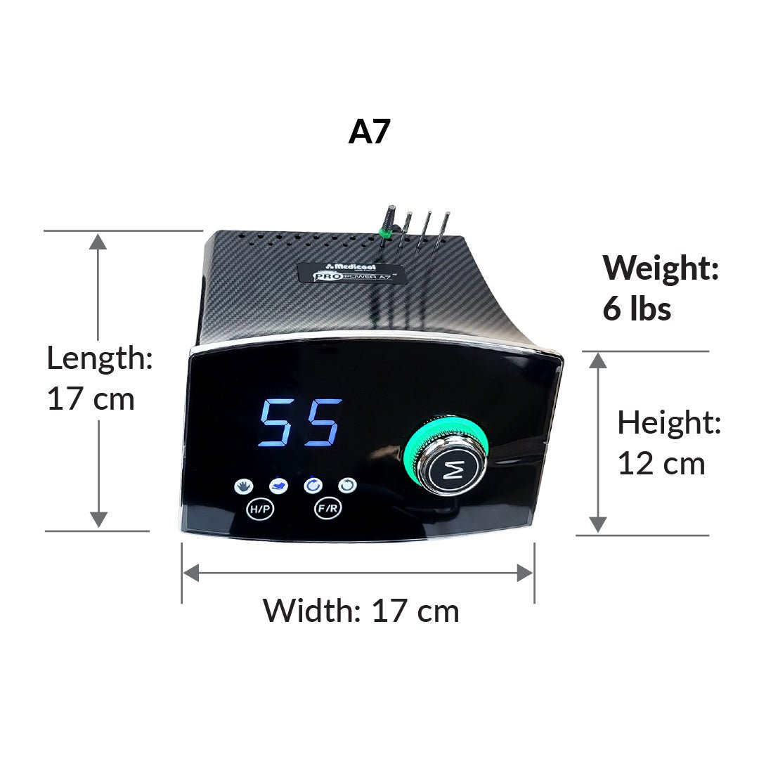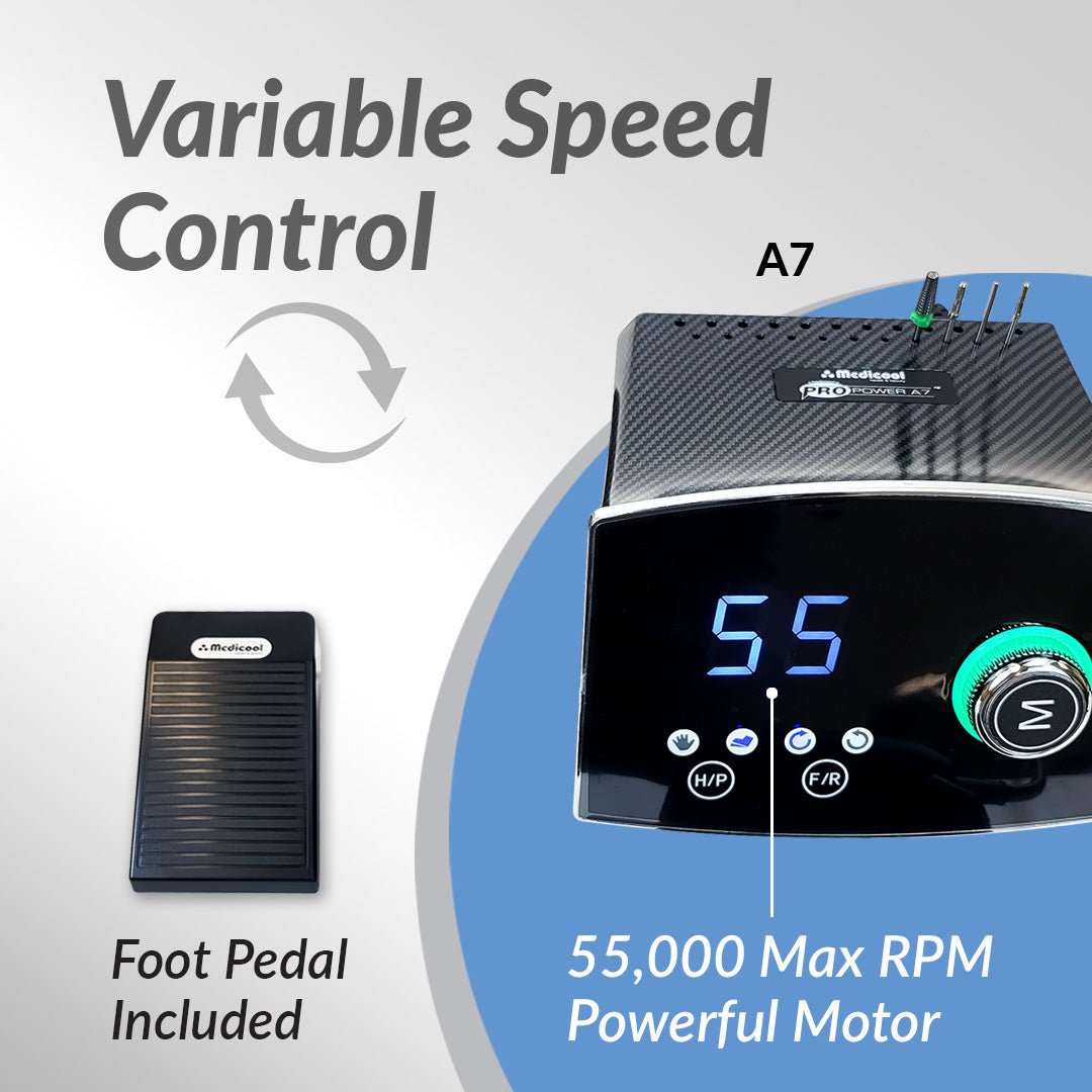 Medicool’s Pro Power A6 & A7 Lab Handpieces have Brushless Motor Technology with 8.8 Ncm Torque, 1000 - 55,000rpm with a lightweight Micromotor, forward and reverse direction, and a digital Speed Control Display. Includes a Variable Speed Foot Control Pedal and can be used anywhere in the world (110v-240v).