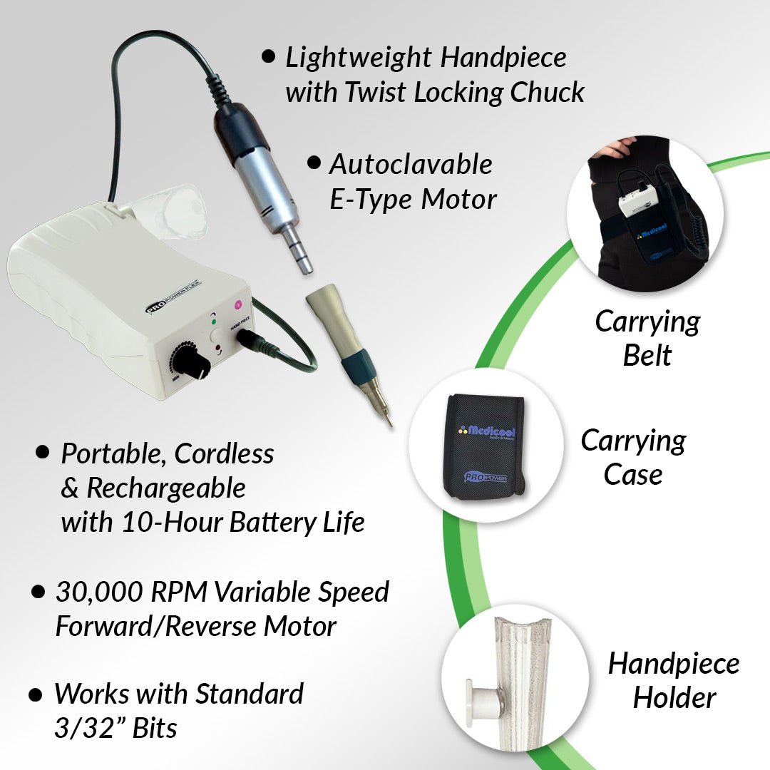 The Pro Power Flex Plus is a high quality cordless, rechargeable Debriding Drill designed to allow for convenient portability making it a must-have in every Podiatrists toolset.