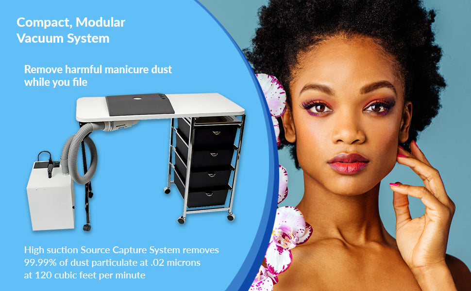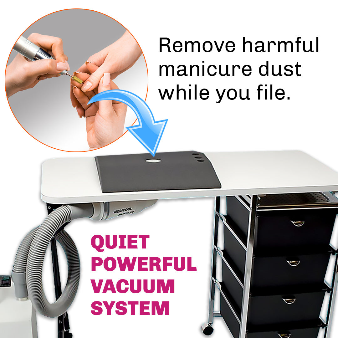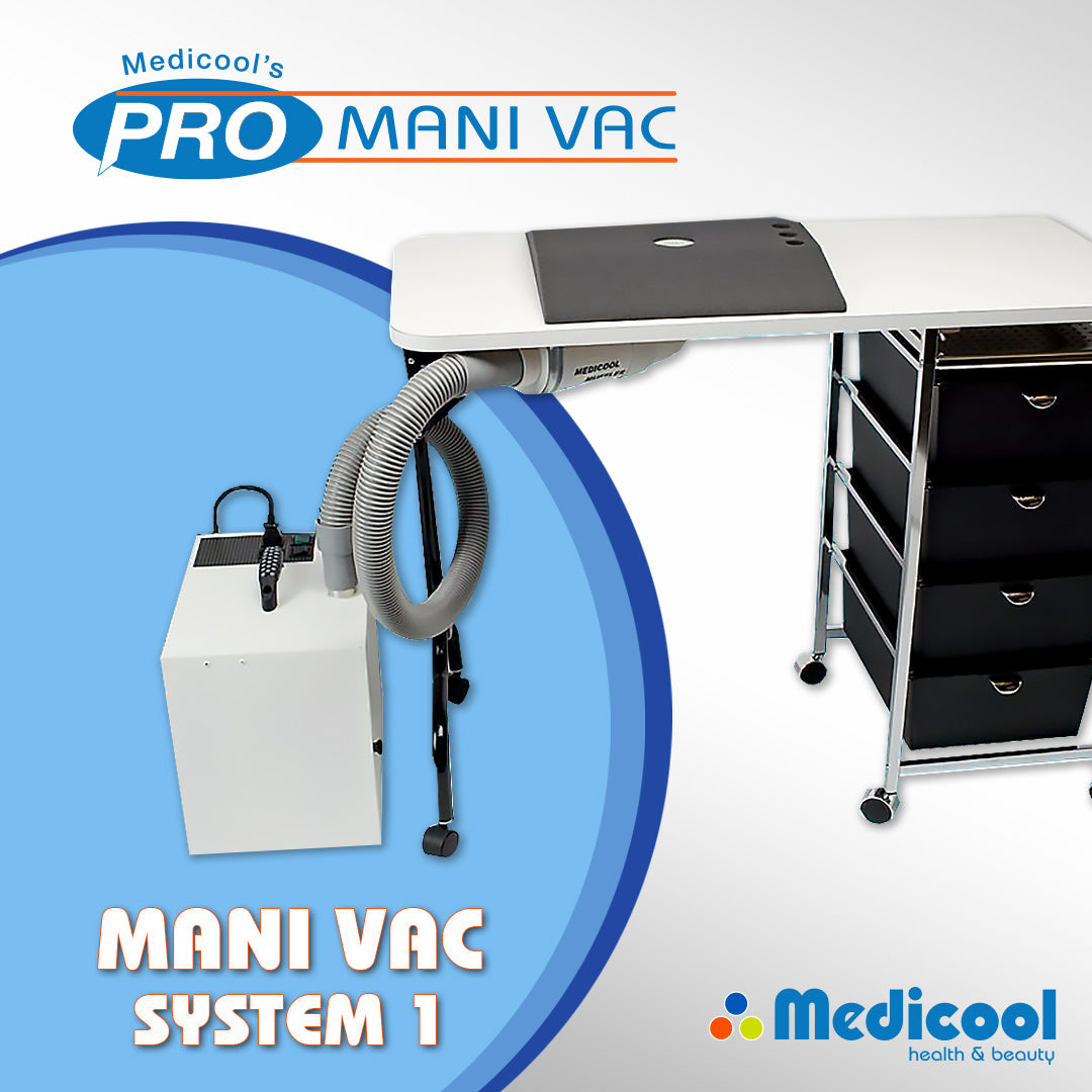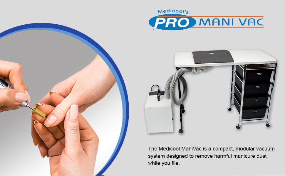 The Medicool ManiVac™ is a compact, modular vacuum system designed to remove harmful manicure dust while you file. The quiet system with only a 53 dbA (Decibel Rating) provides quiet suction with minimal noise.